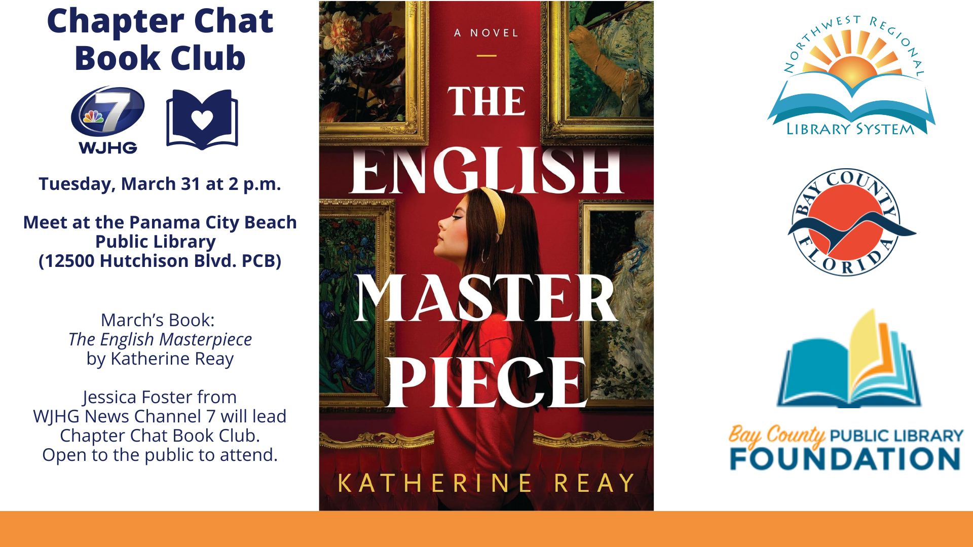 Jessica Foster from WJHG News Channel 7 will lead Chapter Chat Book Club. Come join us to talk about this month’s book and just fun conversation in general! Open to the public to join, no registration required. We will be meeting in the Meeting Room with light refreshments.