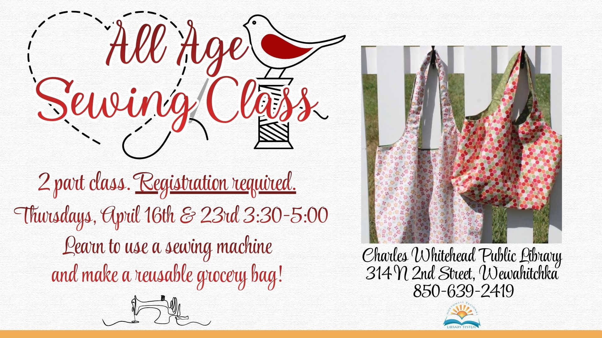 Learn to make reusable grocery bags using sewing machines! This is an all ages program. (caregivers should be with children). This is a two-part class!