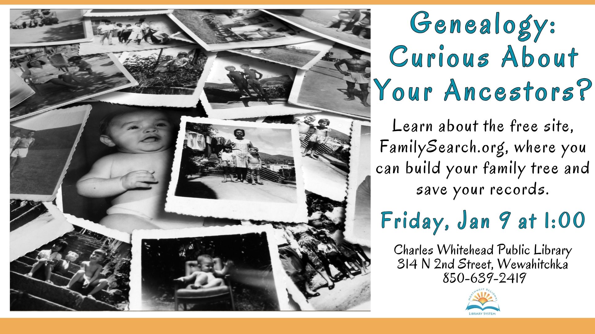 Charles Whitehead Memorial Public Library 314 North Second Street, Wewahitchka, FL, United StatesCome and learn about the free site, FamilySearch.org, where you can build your own family tree and save your records.