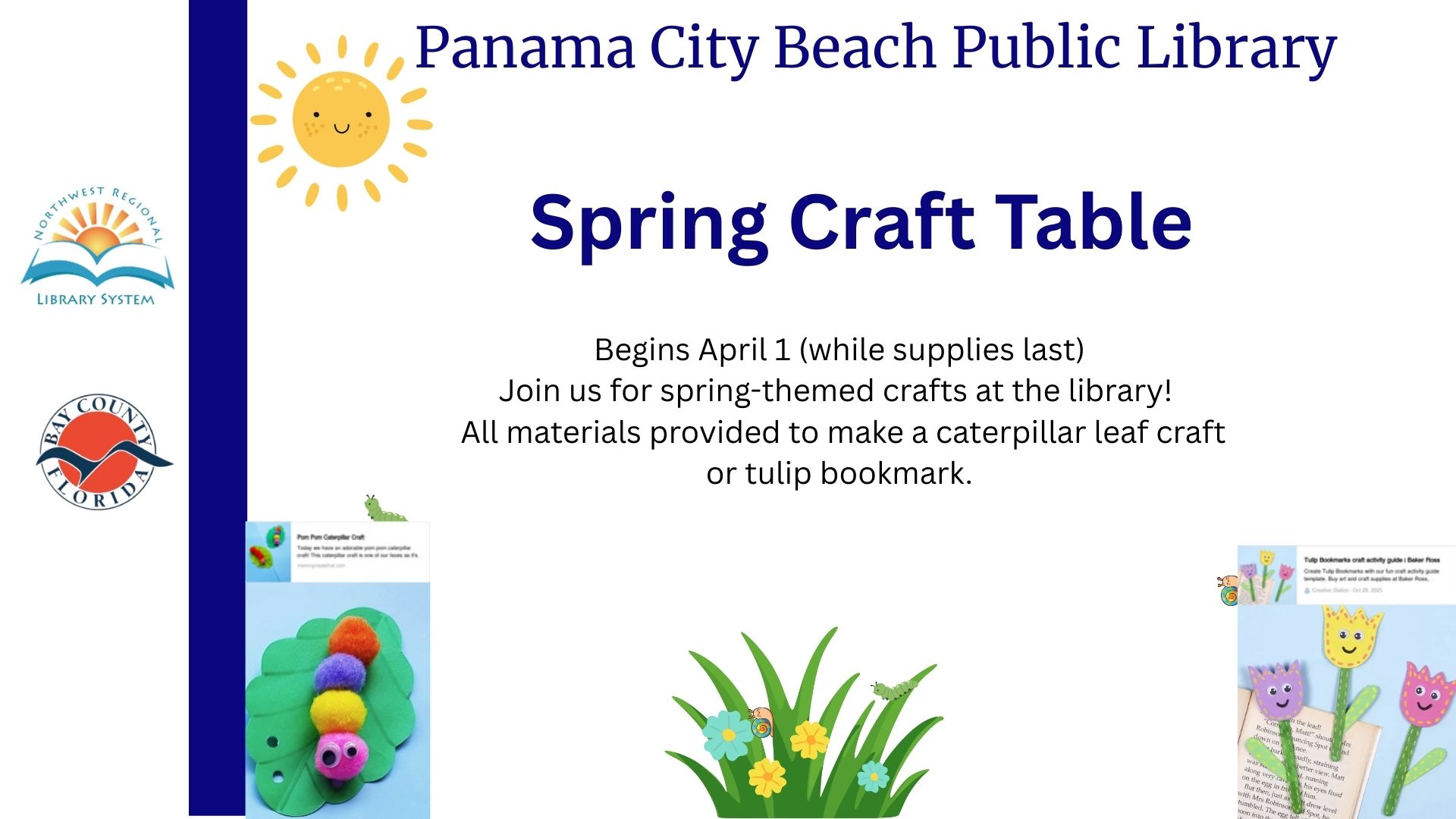 Begins April 1st Join us for spring-themed, self-directed crafts at the library!  Kids can make new friends at the craft table in Youth Services.  Materials provided to make a caterpillar […]