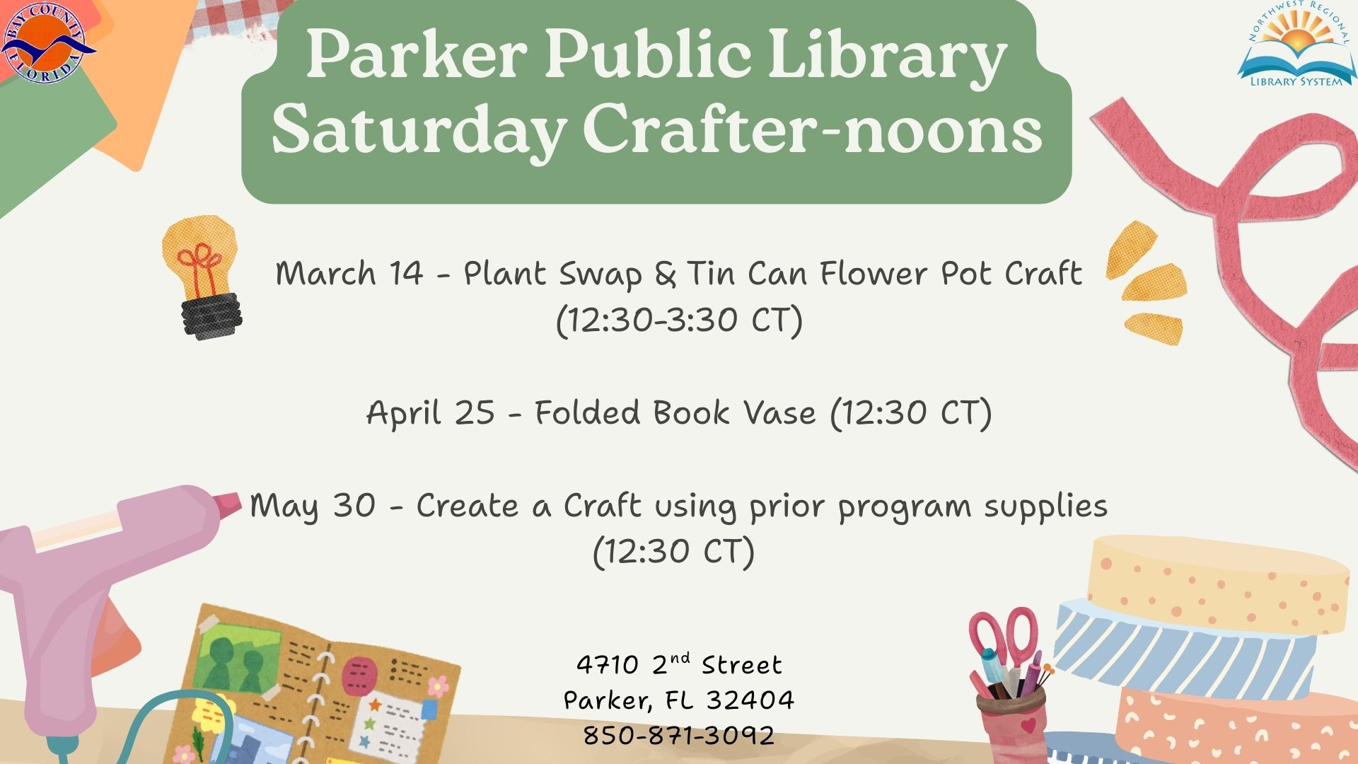 Join us for a monthly craft! Registration required due to limited space and supplies. Call 850-871-3092 to register! March 14: Plant Swap & Tin Can Flowerpot Craft