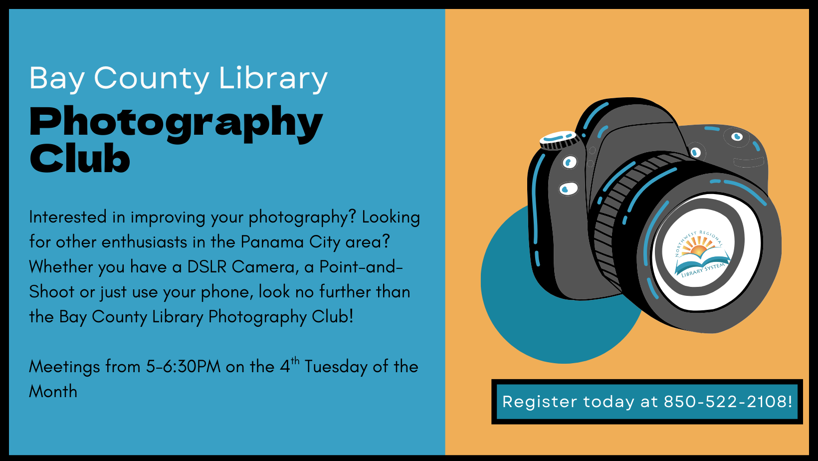 Become more confident in your photography skills and have fun while doing it at Photography Club! We'll have workshops, competitions, and photo challenges. Registration required, call 850-522-2107 to register!
