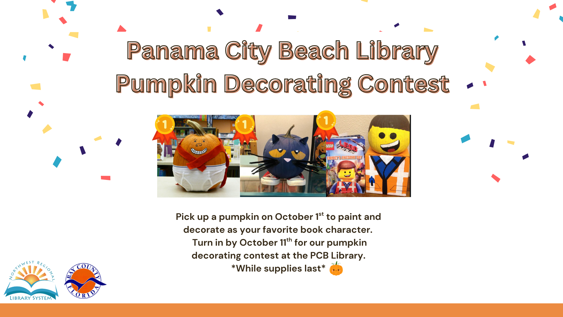 Get ready to show off your creative side! Pick up your pumpkin on October 1 and return it by October 11 decorated as your favorite book character. Pumpkins will be displayed and voted on. *while supplies last