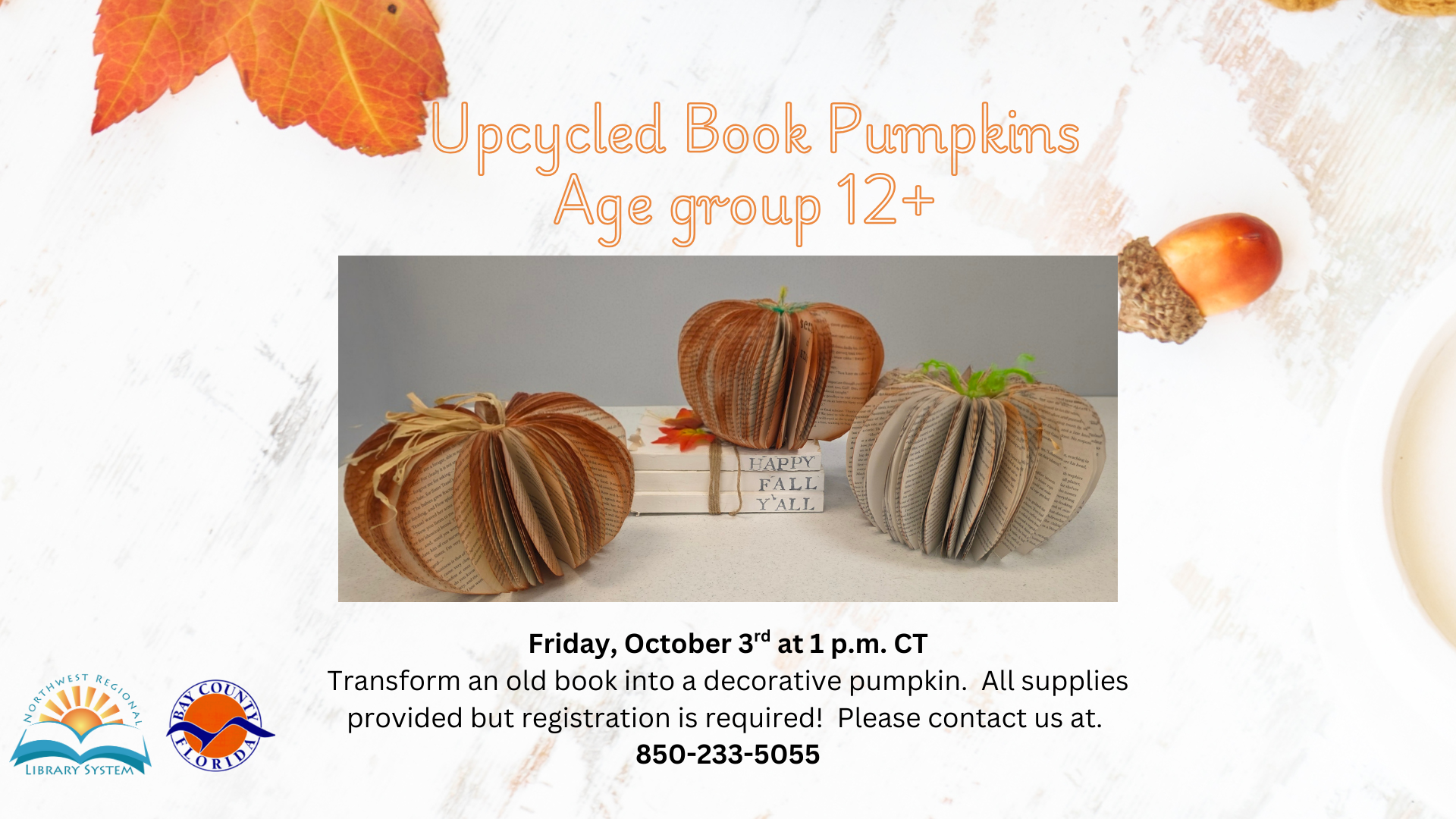Transform an old book into a decorative pumpkin! All supplies provided, but registration required. Call 850-233-5055 to register!
