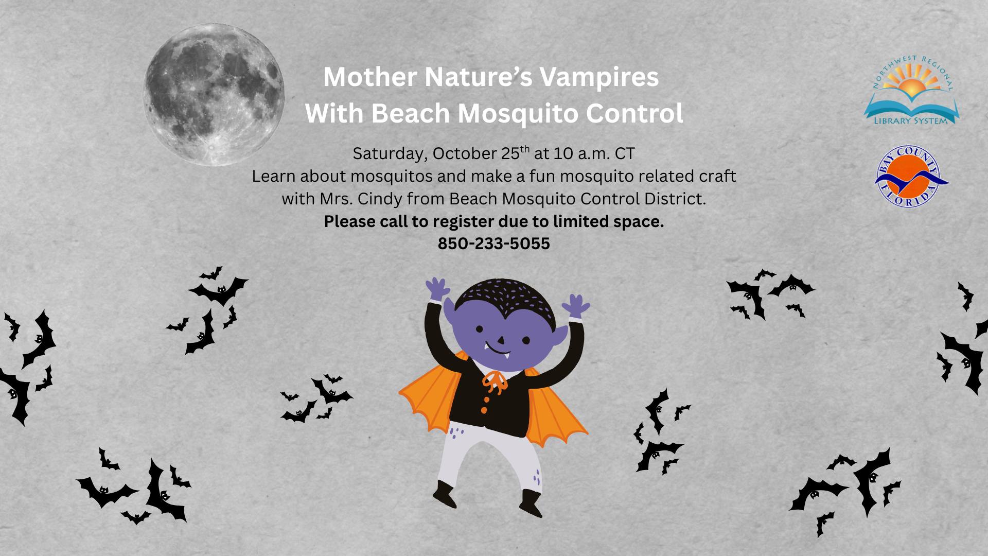 Learn all about mosquitos and create a fun craft! Due to limited spacing, call 850-233-5055 to register!