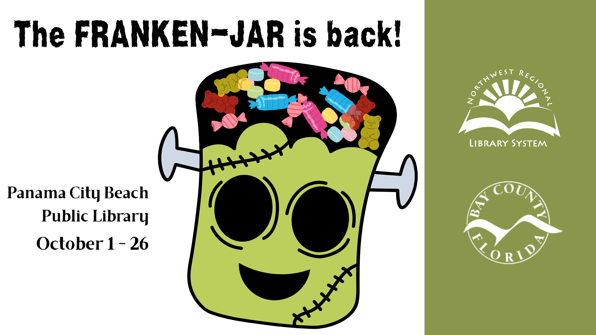 Stop by the library October 1 - October 26 to guess how many candies are in the jar. Closest guess without going over wins!