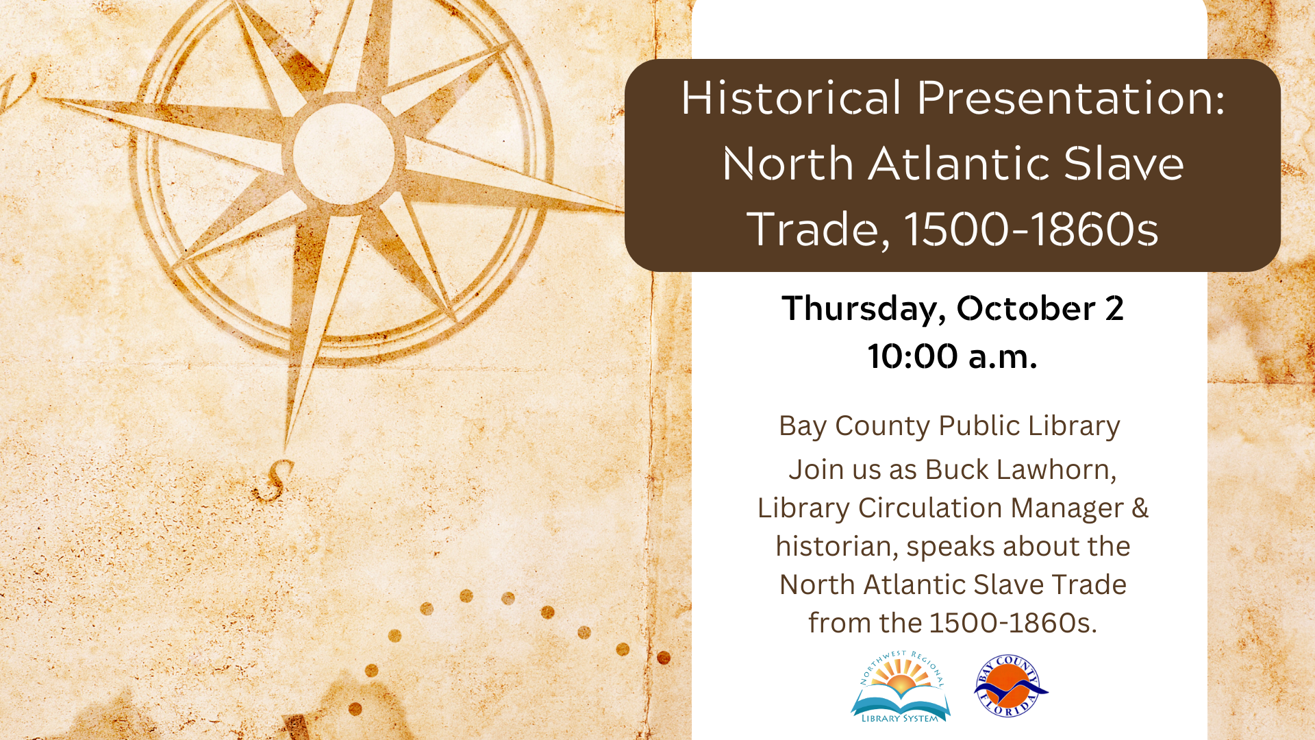 Join us as Buck Lawhorn, Library Circulation Manager and historian, speaks about the North Atlantic Slave Trade in the 1500-1860s. This program is geared for adults.