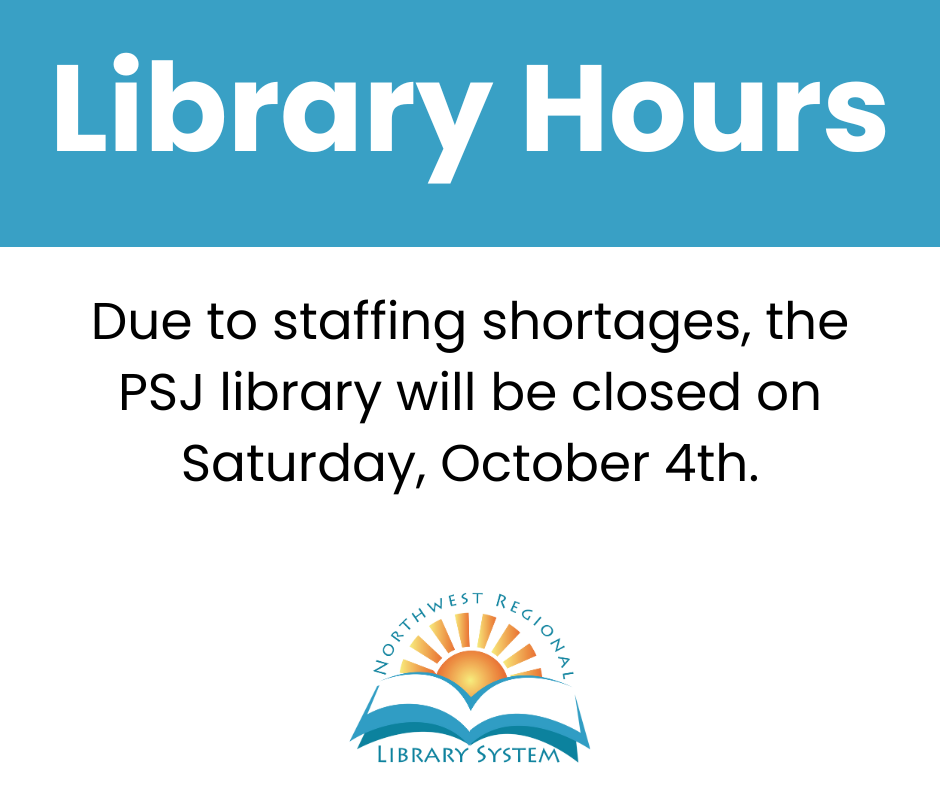 The PSJ Library is closed on Saturday, October 4th. Regular business hours will resume on Monday, October 6th.