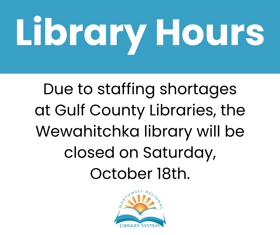 The Wewahitchka Library is closed on Saturday, October 18th. Regular business hours will resume on Monday, October 20th.