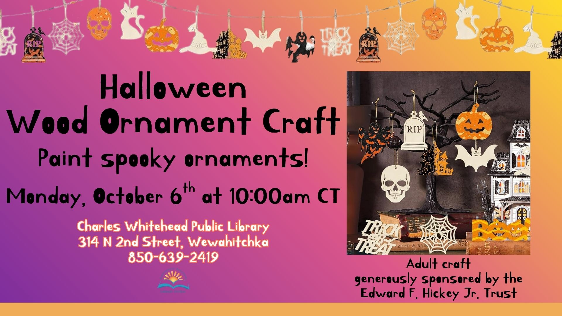 Create a spooky ornament at the Wewahitchka Library on Monday, October 6th at 10:00 a.m. CST! This program is for adults. Supplies were generously funded by the E.F. Hickey Jr. […]