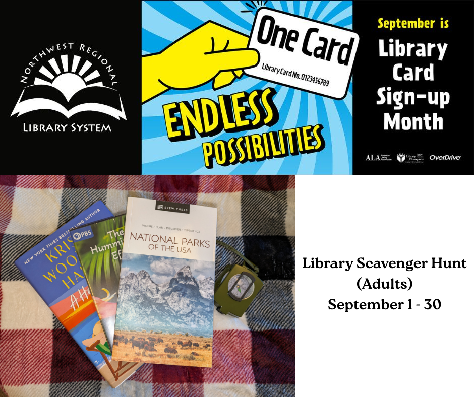 Library Scavenger Hunt (Adults) September 1 - 30 Complete a scavenger hunt at the library and be entered in our Library Card Sign-Up Month raffle! Limit one scavenger hunt per adult. Participating Library: Bay County Public Library Prize: a blanket, compass, National Parks of the USA travel guide, PBS The Hummingbird Effect DVD, & A […]